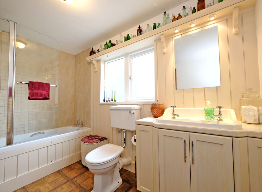 A well proportioned family bathroom is ideally situated on the upper floor complete with a three piece white suite comprising a wash hand basin set within a vanity unit providing storage, vanity mirror and shelving above with downlighters and a wood panelled wall. WC and a bath with overhead shower, tiled splashback and shower glass. Chrome ladder style radiator, parquet effect flooring and a double frosted window to the rear.