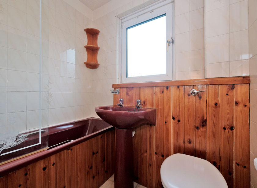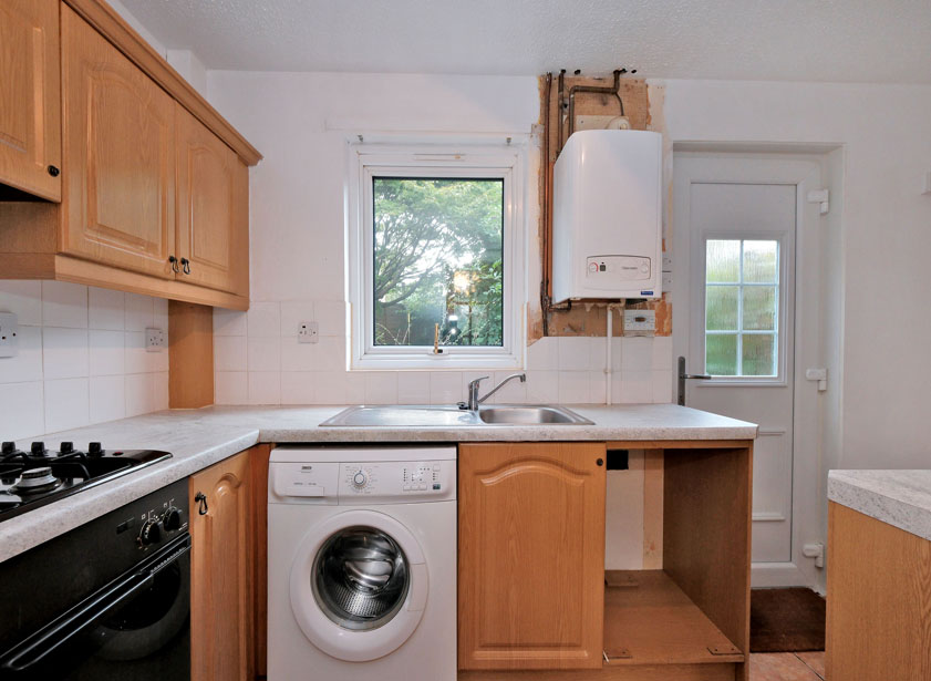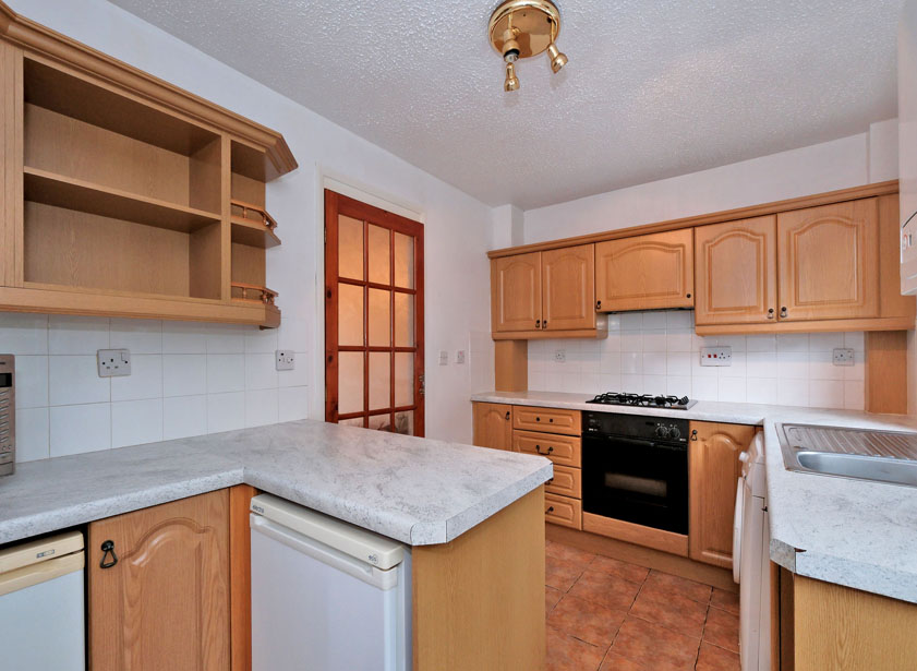 A paned glazed door leads through to the kitchen which includes a range of wood effect floor and wall units with ample worksurfaces. An integrated four burner gas hob and electric oven, free standing washing machine, fridge and freezer. Window looking out over the rear garden and partially glazed UPVC door. The gas central heating boiler is wall mounted.