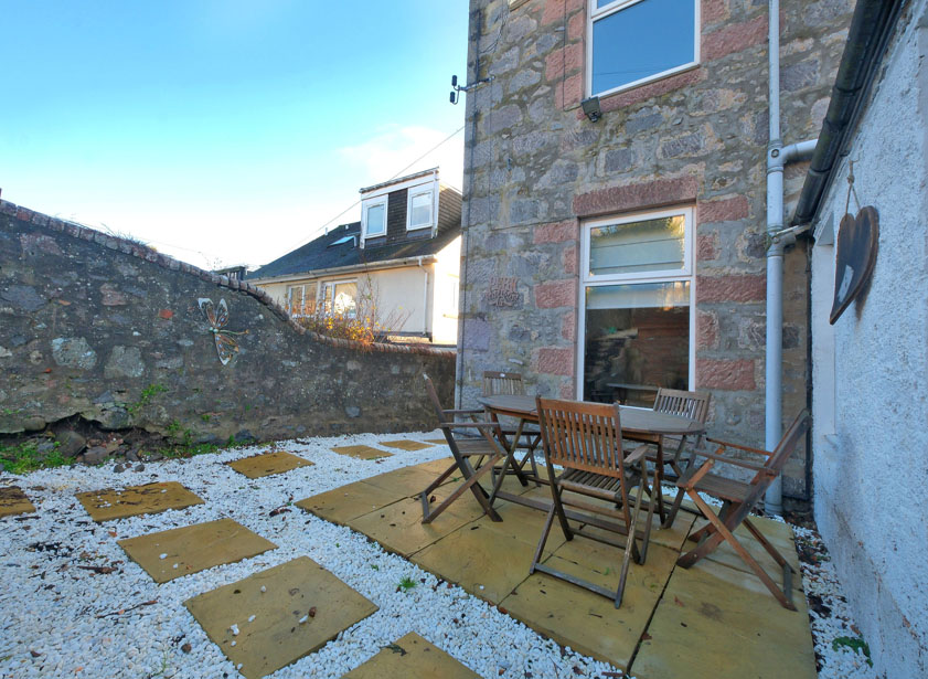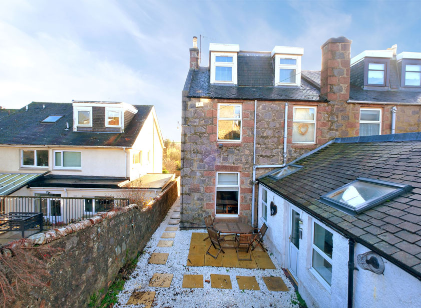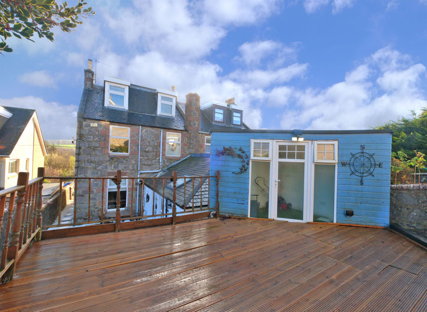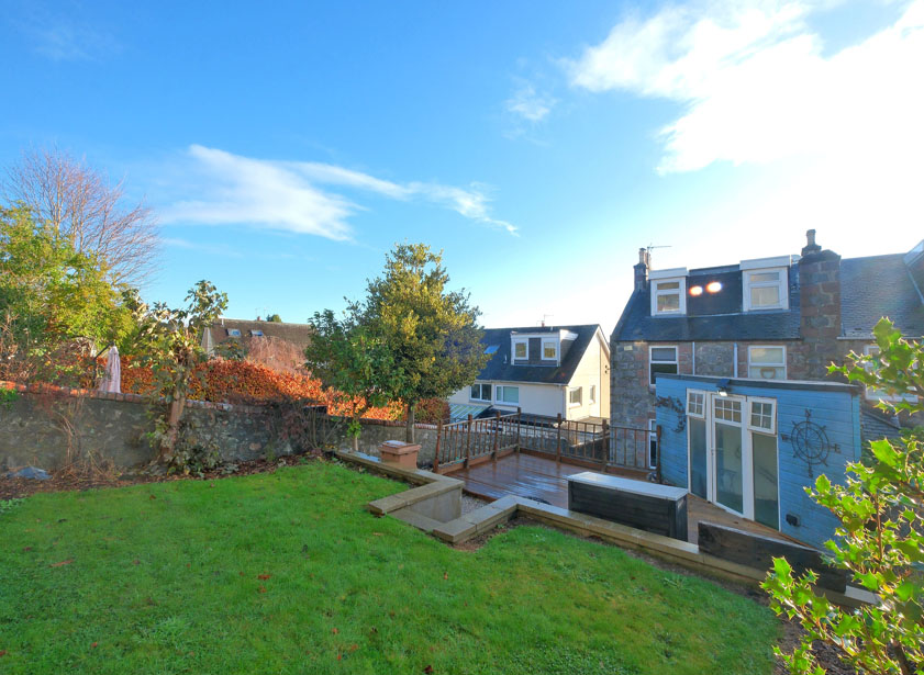The fully enclosed terraced garden to the rear has a patio area and steps leading to a decked area, a further set of steps lead to the summer house, fire pit and a raised lawn area.