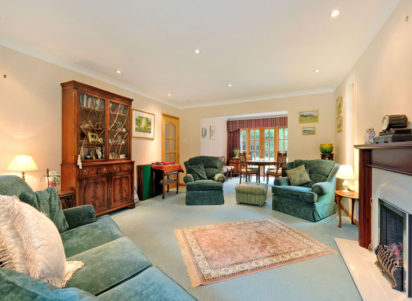 The lounge and dining room are on semi-open plan. The lounge features a large window overlooking the rear garden and a gas fire set in a stone hearth with a wooden surround and mantel piece. The dining area is sufficiently proportioned to allow for the placement of a large table and chairs as well as other items of free-standing furniture. Glazed, double doors from the dining area lead out to a deck and the remainder of the front garden beyond.