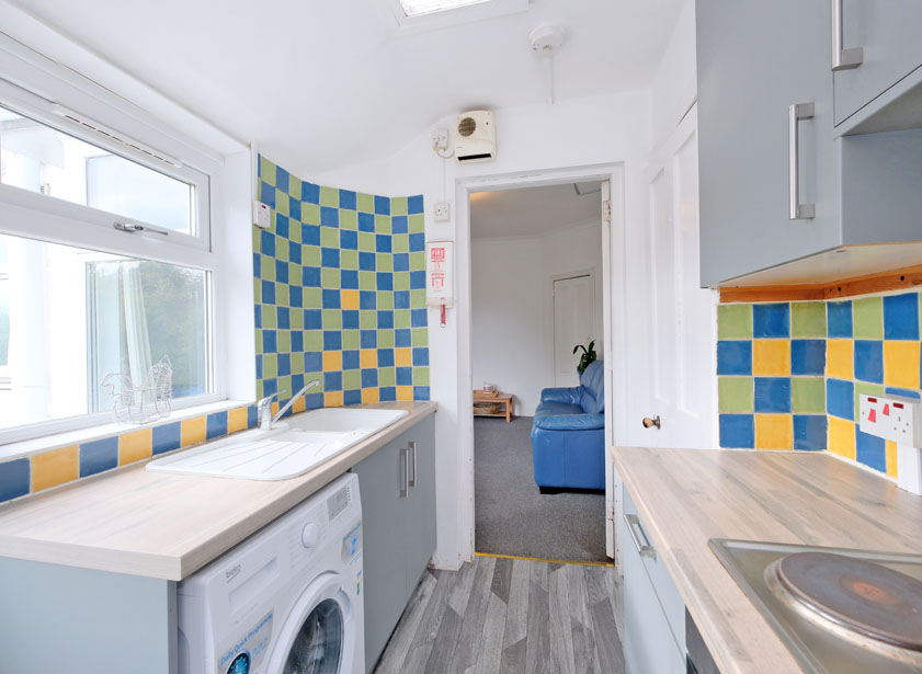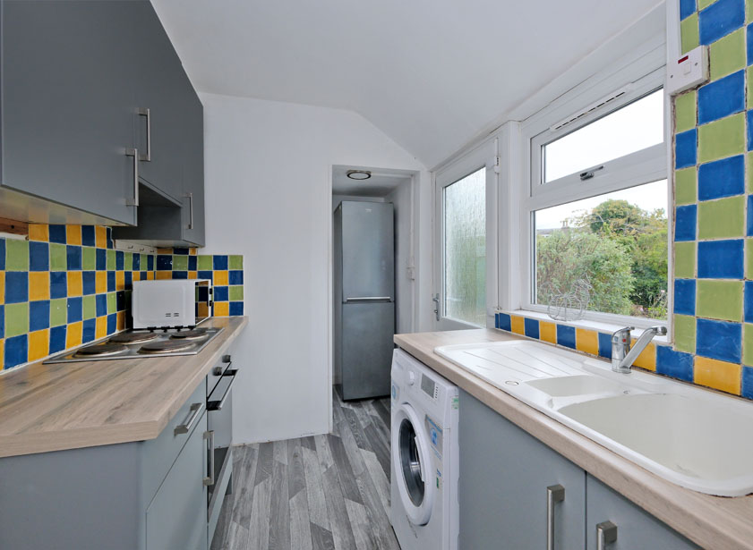 A well-appointed galley style kitchen is fitted with a range of wall and base units, ample work surface and splash back tiling. The integrated electric hob and oven/grill will remain along with the free standing washing machine. A recessed alcove offers additional storage/ utility space and houses the free standing fridge/ freezer and tumble drier which will be included in the sale. Window to the rear and part glazed UPVC door to the rear garden.