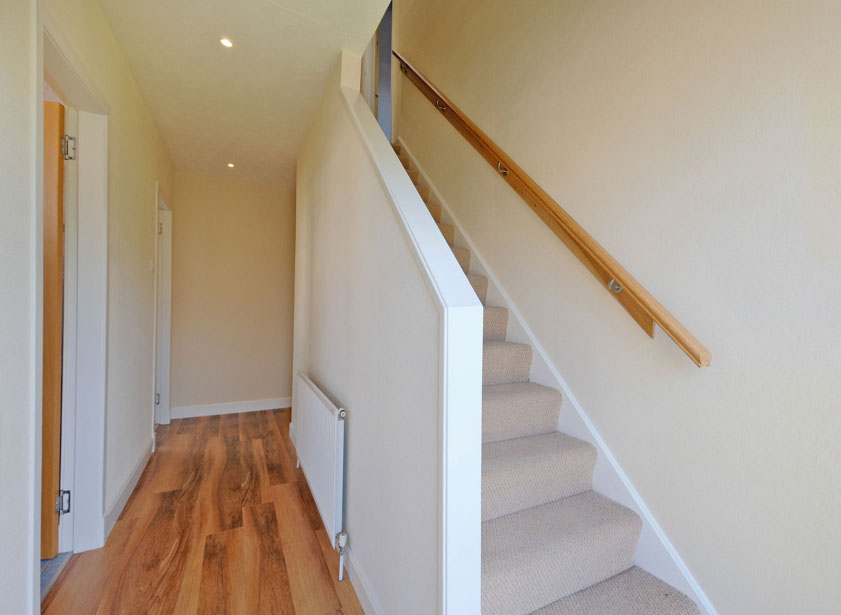A uPVC door gives access to the hallway with glazed screens and a staircase leading to the upper floor; large storage cupboard provides storage and a small cupboard houses the consumer unit.