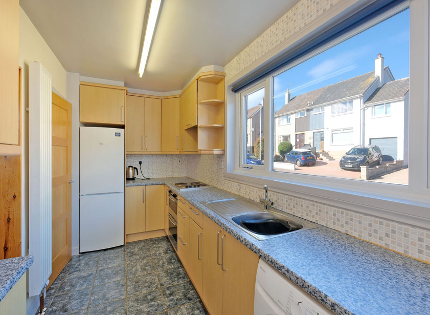 The kitchen is fitted with a wide range of wood effect wall and base units. Ample co-ordinating work surfaces incorporating a stainless steel sink with tap and drainer Integrated electric hob with double electric oven below and extractor above. Free standing appliances include fridge/freezer and washing machine which will remain. A window overlooks the side of the property. A UPVC door leads to the rear garden.