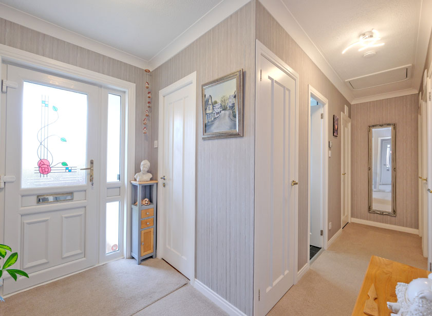 Entered via a part glazed composite door with decorative glazed panel and matching side screen, this L shaped hall benefits from two fitted storage cupboards, one housing the central heating boiler. Hatch to fully insulated loft space.