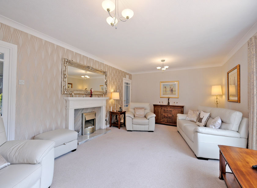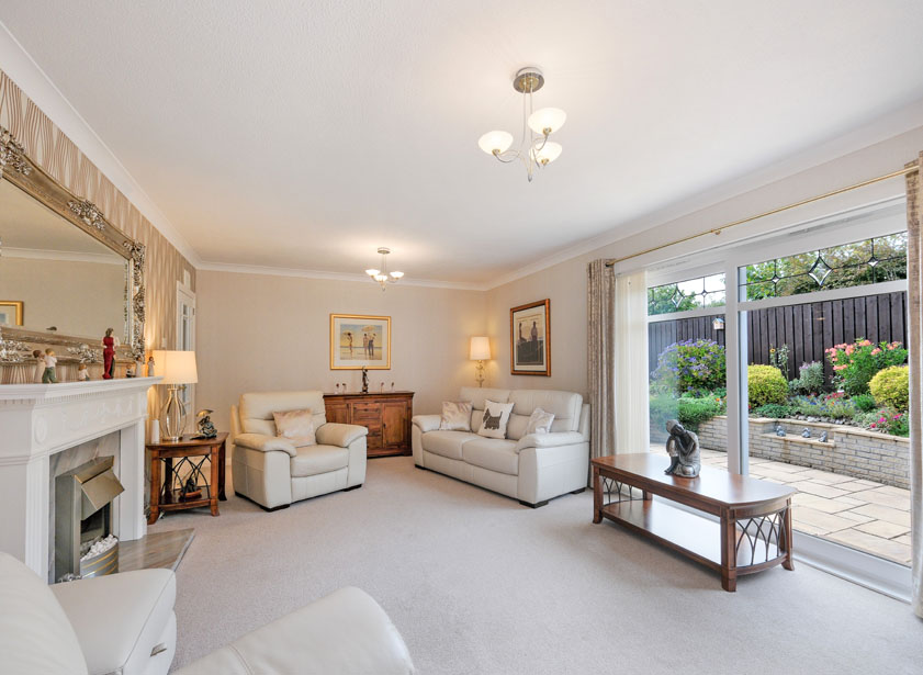 Of generous proportions, this light and airy lounge features sliding patio doors to the west facing terrace to the rear. A particular focal point is the ornate fire surround with marble back plate and hearth housing an electric inset fire. Double doors with glazed sections lead to the dining room.