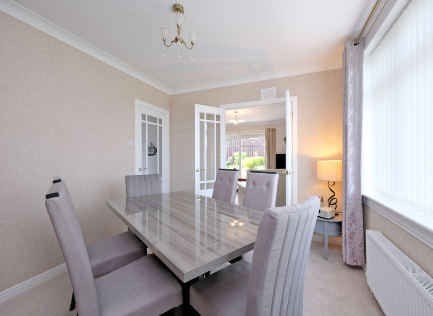 Overlooking the front of the property, this spacious dining room offers ample space for a range of furnishings, door to kitchen.