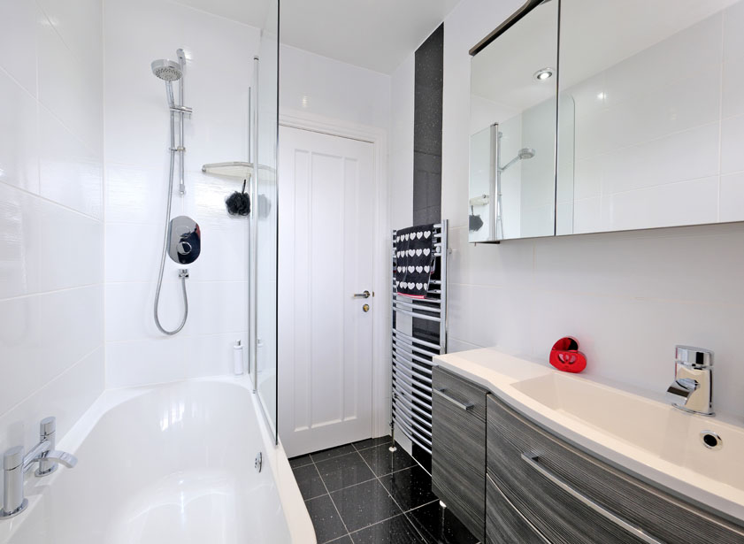A well-appointed family bathroom is fitted with a modern white three piece suite comprising W/C, suspended vanity unit housing wash hand basin, with mirrored wall cabinets above. Bath with mains pressure shower over and glazed screen alongside, fully tiled around the bath/ shower area and ceramic tiled floor with underfloor heating. Heated towel rail, opaque window.