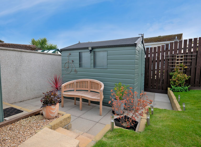 The property features an expanse of lawn to the front with decorative borders stocked with a variety of established shrubs. The attractive loc bloc path continues to the rear and side gardens. Screened by timber fencing the garden enjoys a high degree of privacy, mainly laid to lawn with raised borders stocked with established shrubs. Of particular note is the secluded sun terrace enjoying a westerly aspect with raised planted embankment stocked with an abundance of established shrubs and seasonal plants, making an ideal location for outdoor entertaining. The timber shed and green house will remain. External lighting and water tap.