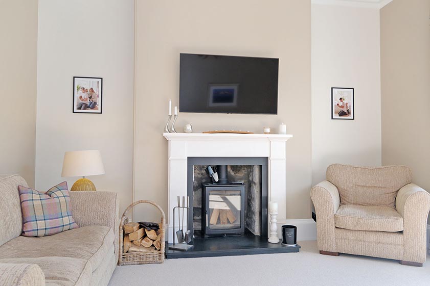 Overlooking the front garden via a large window, the lounge is a tastefully appointed living space. Fully carpeted, central to the room is a woodburning stove with attractive mantel surround – perfect for creating a cosy ambience during the colder weather. The wall mounted television will remain.