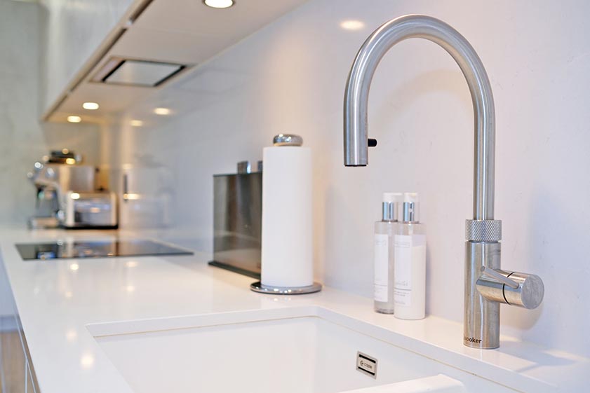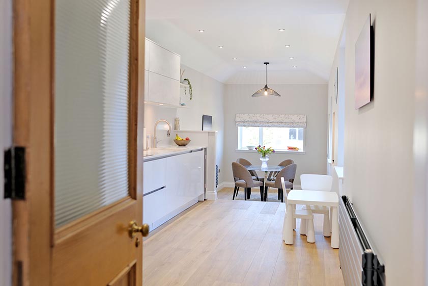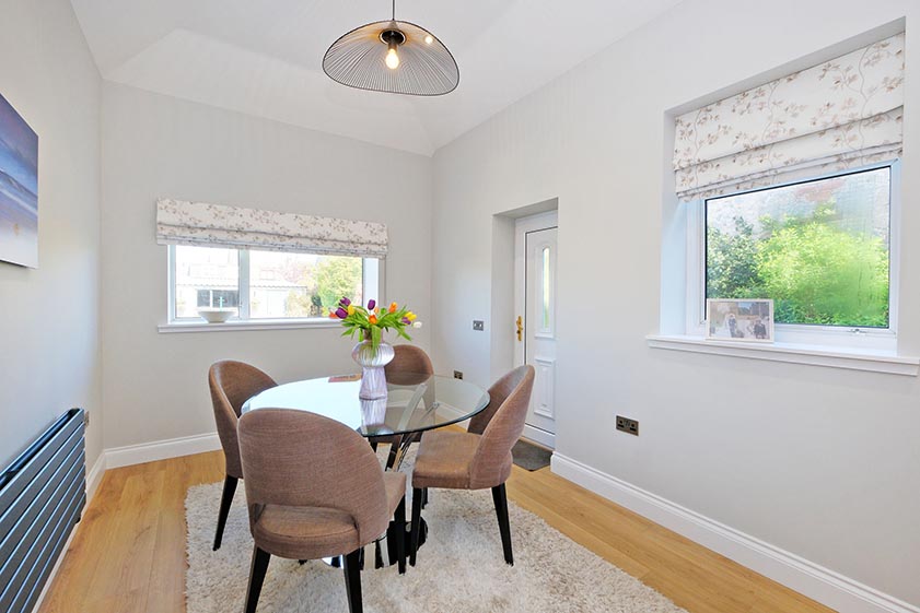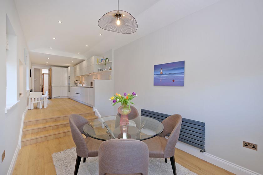 Enjoying dual aspect views over the rear garden is the stunning dining kitchen. Fitted with an extensive range of contrasting base and wall units with under unit lighting, a quartz worksurface incorporates a four ring electric hob with overhead extractor, in addition to a 1.5 sink with Quooker tap. The kitchen includes a range of integrated appliances, including a fridge/freezer, combination microwave with separate oven, dishwasher, combination washing machine/tumble dryer and slimline wine cooler. The formal dining area lies on a split level to the kitchen, with a partially glazed door providing entry to the courtyard.