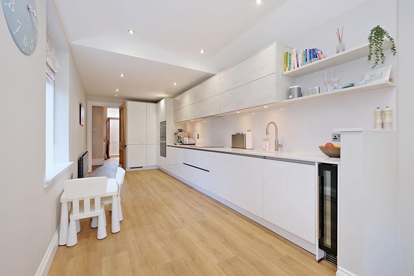 The fully enclosed rear garden is sure to appeal to all members of the family. A paved courtyard is accessible from the dining kitchen. Climbing plants and borders provide seasonal colour, while steps down from the courtyard lead into the extensive basement space. Accommodating head height access, the basement houses the central heating boiler as well as providing excellent storage space.