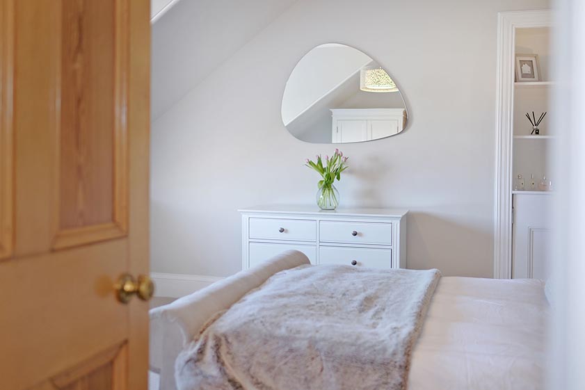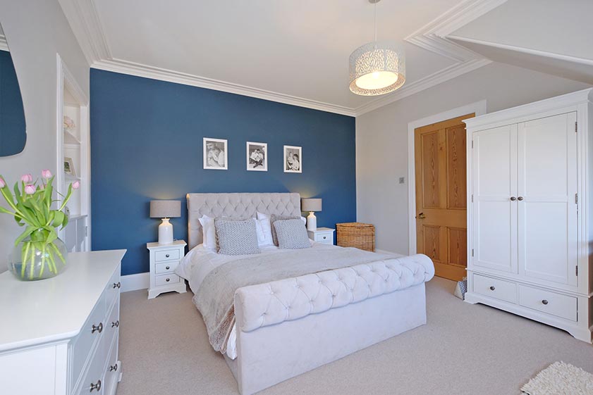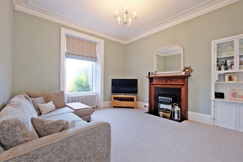 The principal bedroom enjoys elevated views over the rear garden via a large deep silled window. Of tasteful decoration and neutral carpeting, an alcove includes a half height cupboard. Double bedroom two is of neutral décor and carpeting while a shallow fitted cupboard provides storage. A deep silled window provides views over the property frontage. Double bedroom three is also situated to the front of the property and is a pleasant, bright room.