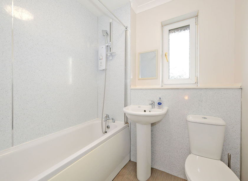 Completing the accommodation is the family bathroom featuring a white three piece suite, with electric shower appliance above the bath, sink and WC. Aqua panels around bath/shower area and to dado height elsewhere. Ceramic tiled floor. A frosted window provides natural light.