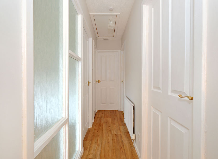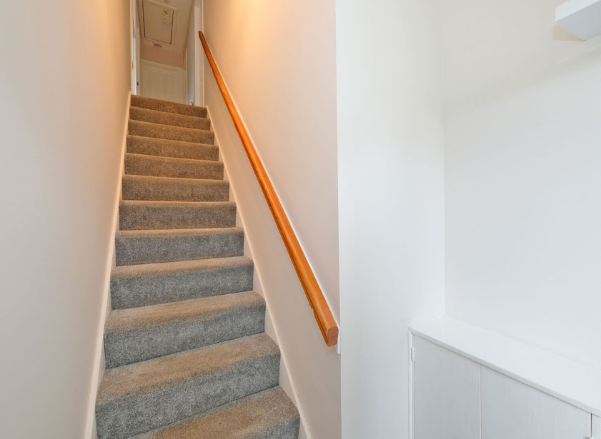 A carpeted staircase leads to the first floor, with the main hallway giving access to all the accommodation. A hatch with Ramsay ladder leads to the attic. A storage cupboard provides extra storage facilities.