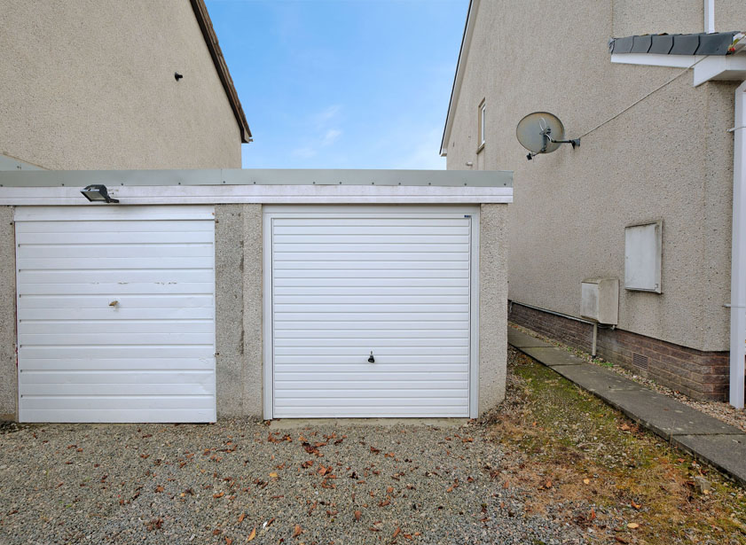 A shared driveway leads to the exclusive single garage with up and over door. The garage is equipped with power and light. A door at the rear of the garage provides access to the rear garden as well as a path to the side of the garage. The garden is mainly laid to lawn with a patio area.