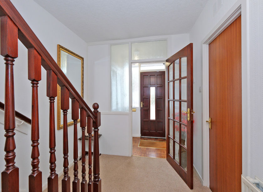 A door with glass side screen gives access to a vestibule with storage cupboard and a further cupboard housing the consumer unit.
