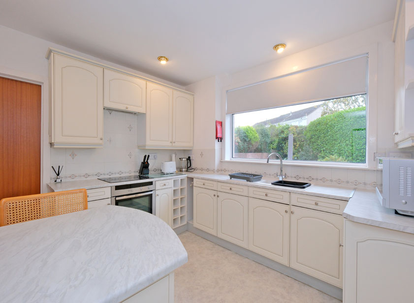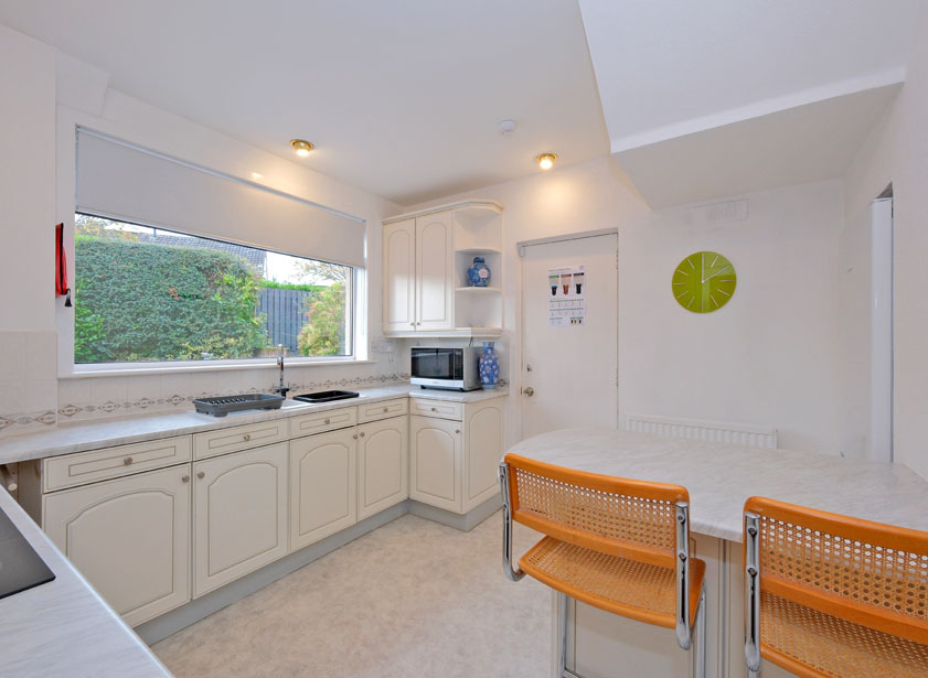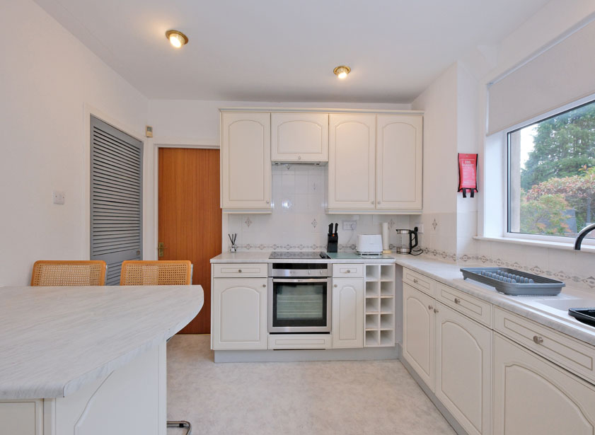 The kitchen is fitted with a wide range of white wall and base units. Ample co-ordinating work surfaces incorporating 1.5 bowl cream sink with tap and drainer and tiled splashbacks. Integrated electric hob with electric oven below and extractor above. Free standing fridge freezer. Breakfast bar with storage provides room for dining. The stools will remain. Large pantry cupboard provides extra storage. A picture window overlooks the rear of the property. A door leads to the rear garden and the garage.