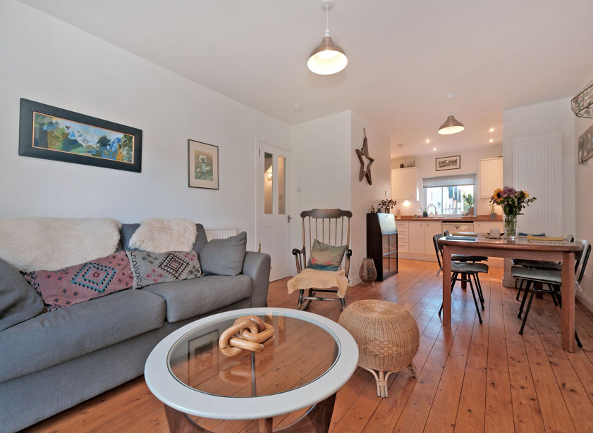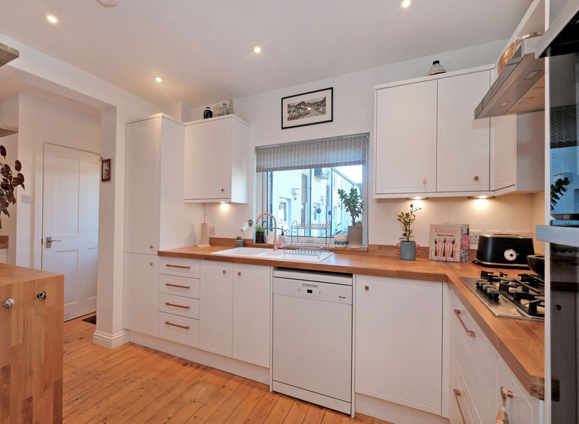 On semi open plan with the lounge/ dining area, a well-appointed kitchen is fitted with a wide range of wall and base units in a contemporary shaker style. Ample solid wood worksurface with matching upstand. 1.5 bowl composite sink with mixer tap. Integrated 4 ring gas hob with extractor canopy and stainless steel splash back will remain along with double oven/ grill and free standing fridge/ freezer. A fitted cupboard is plumbed for a washing machine and houses the central heating boiler and whole house water filtration unit. Window and part glazed hardwood door to the pedestrian courtyard to the rear.