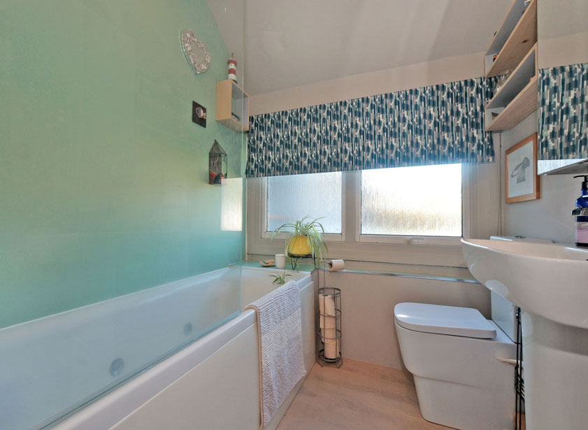 Fitted with a white three piece suite comprising w/c, wash hand basin, jacuzzi bath with shower over and glaze screen alongside. Fully aqua lined around the bath/ shower area. Opaque window to the rear. Heated towel rail.