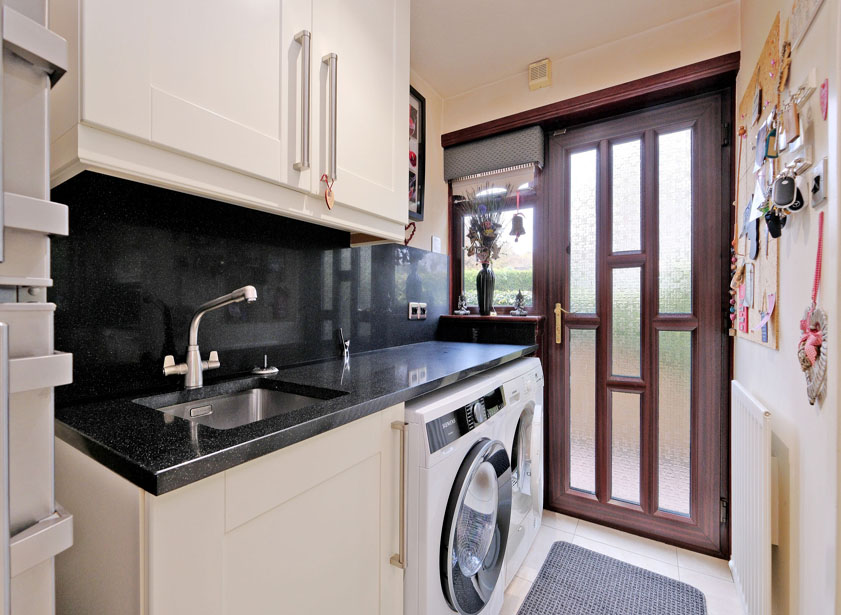 Accessed via the kitchen, this useful utility room is fitted with additional wall and base units with granite worksurface and matching splash back. Stainless steel sink with mixer tap and drainer. The free standing fridge/ freezer, washing machine and tumble drier will remain. Glazed UPVC door with window alongside leads to the side of the property. Polished marble tiled floor.