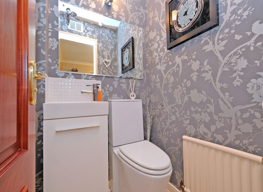 A centrally set cloakroom fitted with a modern two piece suite and polished marble tiled floor completes the ground floor.