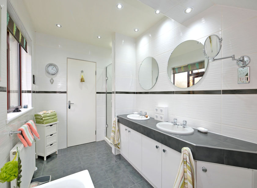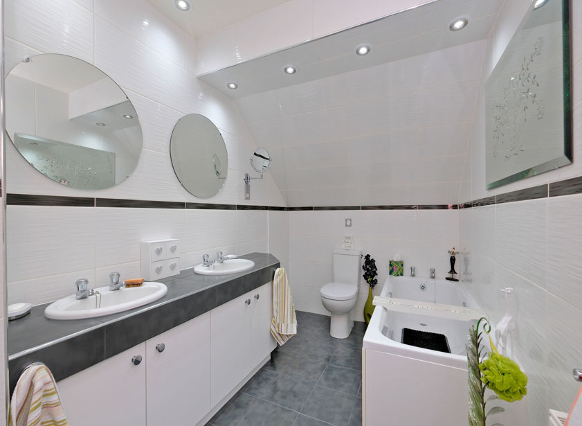 A well-appointed family bathroom is fitted with a three piece suite and separate fully tiled shower enclosure housing a rainfall shower head. Fully tiled throughout and ceramic tiled floor. Opaque window to the front.