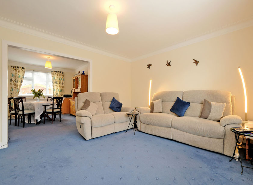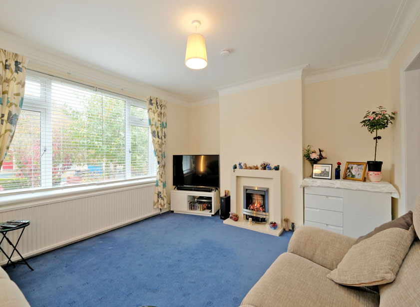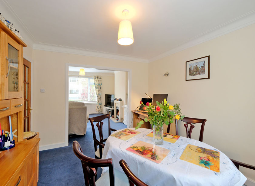 Enjoying a semi open plan layout with the dining area, this light and airy lounge with large picture window overlooks the front of the property. A particular focal point is the modern fire surround with matching hearth housing a living flame fire.