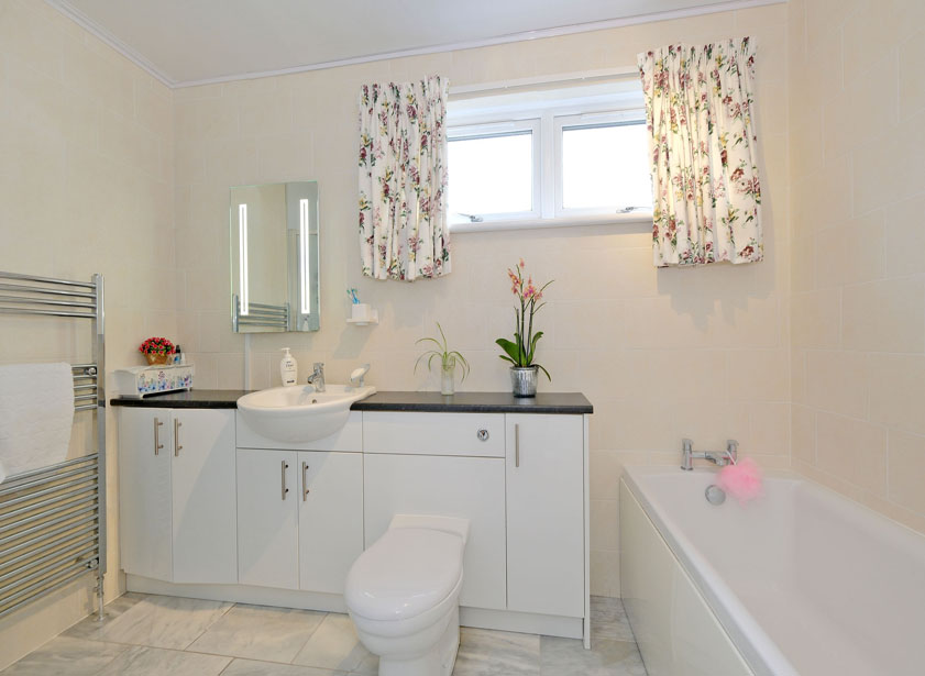 A good sized family bathroom located on the ground floor is fitted with a white suite comprising vanity unit housing the w/c and wash hand basin, bath and separate aqua lined shower enclosure housing a MIRA shower. Fully tiled throughout and ceramic tiled floor. Opaque window to the side.