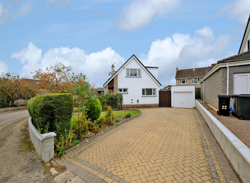 The property occupies a large corner plot screened to the front/ side by mature conifer hedges and low-level stone wall. An extensive loc bloc driveway provides off road parking for several cars and leads to the detached single garage with up and over door, equipped with power and light.
