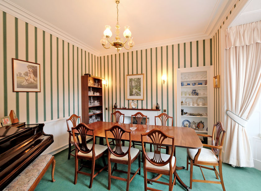 The dining room is a stunning space overlooking the front of the property, featuring a traditional open fireplace with wooden surround. The room is generously sized, offering ample space for a large dining table and chairs, as well as additional free-standing furniture. A large bay window fills the room with natural light, while built-in shelving adds both character and practicality.