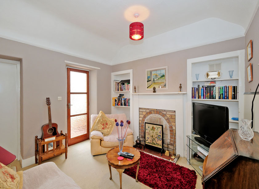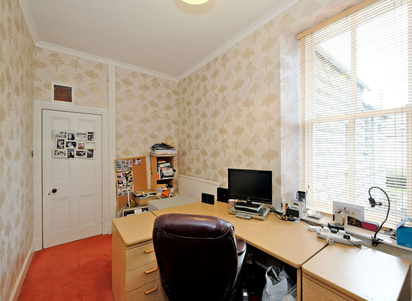 Office/Bedroom six is an adaptable room currently used as a home office but equally suitable as a guest bedroom. The space features an attractive open fireplace with a stone hearth and surround, adding warmth and character. A rear-facing window allows plenty of natural light to flow in.