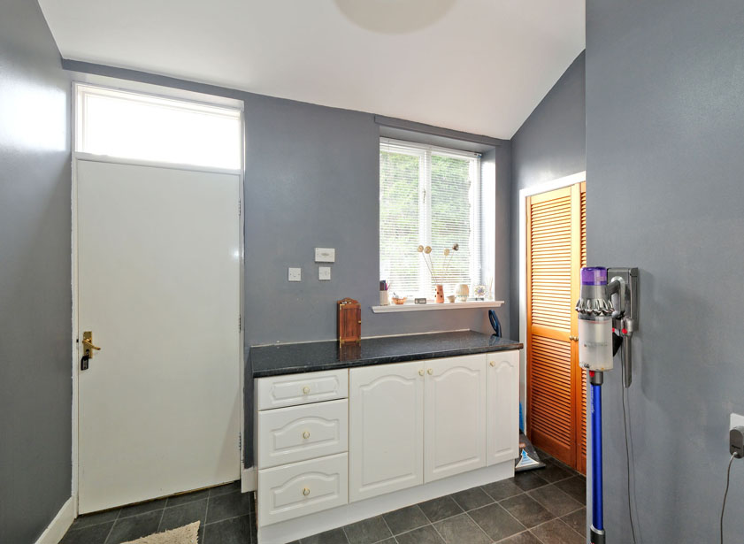 The well-appointed utility room fitted with base units, a tall storage cupboard, and a contrasting work surface. A further cupboard houses the water tank and boiler, while there is ample space for additional white goods. A door provides convenient access to the rear garden.