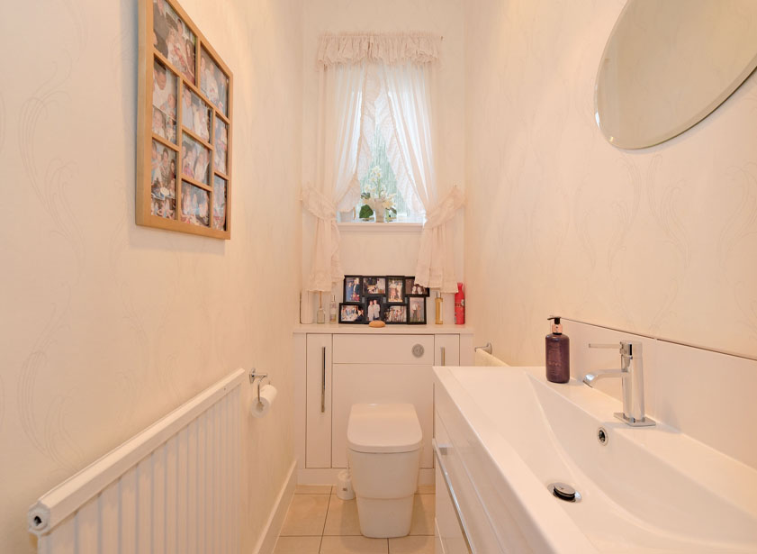 A well-presented cloakroom comprising a modern two-piece suite, including a wash hand basin with storage and a WC. The room is finished with tiled flooring and benefits from a privacy window to the side of the property.