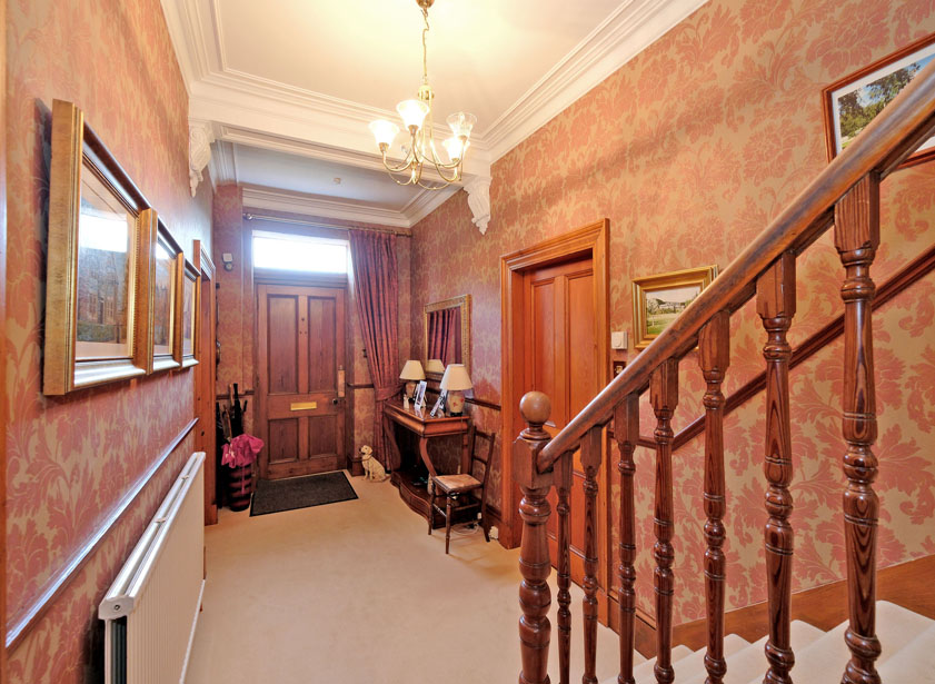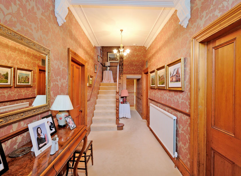Enter the property through a solid hardwood door with a glazed panel above, opening into a spacious hallway that immediately sets the tone for the elegance found throughout. This impressive entrance features high ceilings, decorative cornicing, and a sweeping carpeted staircase with wooden balusters and spindles leading to the upper floor.
