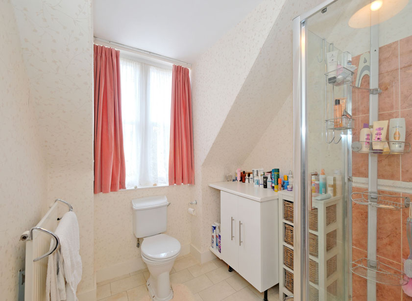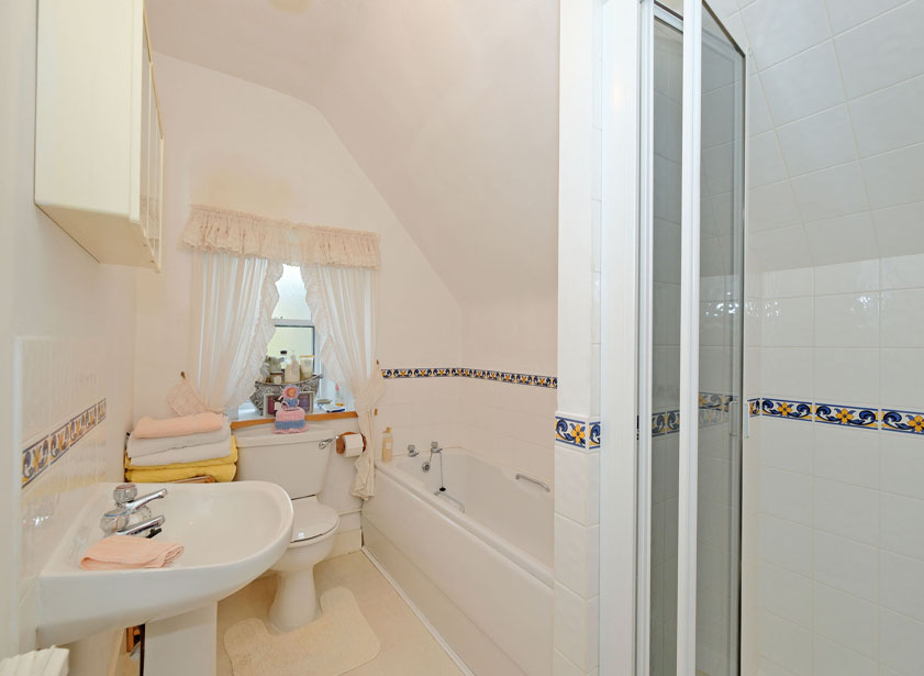 The well-appointed family bathroom features a bath, wash hand basin, WC, and a separate shower cubicle, all finished with tiling to dado height. A privacy window to the side allows natural light. A hatch provides convenient access to the attic.