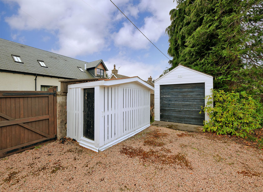 Inchgarth is set within a generous secure garden that wraps around the property. The impressive horseshoe entrance, framed by wrought iron gates, opens onto a stone-chipped driveway with a lawned area to the front. The rear garden is predominantly laid to lawn, enhanced by mature trees, shrubs, and seasonal flowers, providing a tranquil and private outdoor retreat. Paved pathways lead to a stone-chipped area and rear wooden gates. The property also benefits from two single garages and a large coal shed, offering excellent storage and practical outdoor space.