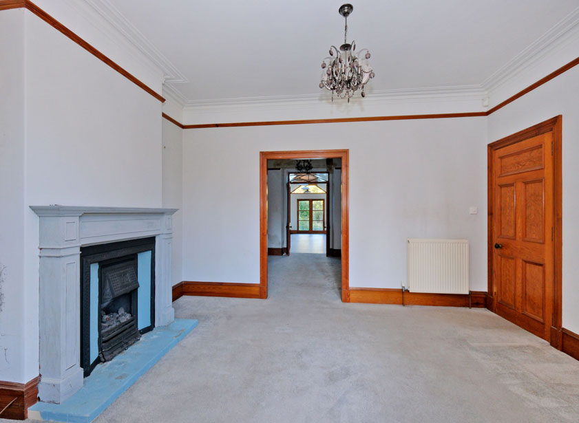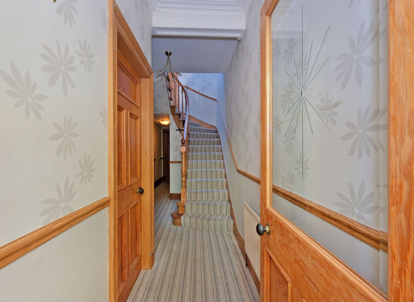 From the entrance vestibule a partially glazed door leads into the reception hall. With a high ceiling and deep skirting, a carpeted staircase with solid wood spindles and balustrade leads to the living accommodation on the first floor.
