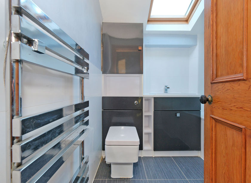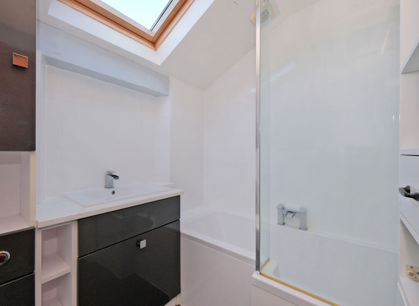 Ascending the carpeted staircase to the mezzanine landing there is the modern family bathroom. A large fitted vanity unit provides storage whilst incorporating the white wash hand basin and WC. The white L-shaped bath includes a central tap fitment, in addition to a mains shower appliance with shower screen above. A skylight provides natural light.