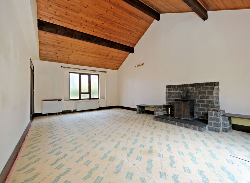 The lounge is a dual aspect room with a large window to the front and patio doors to the rear. The room features a stove set in an exposed brick surround with slate hearth. It is not known if the stove is in working order.