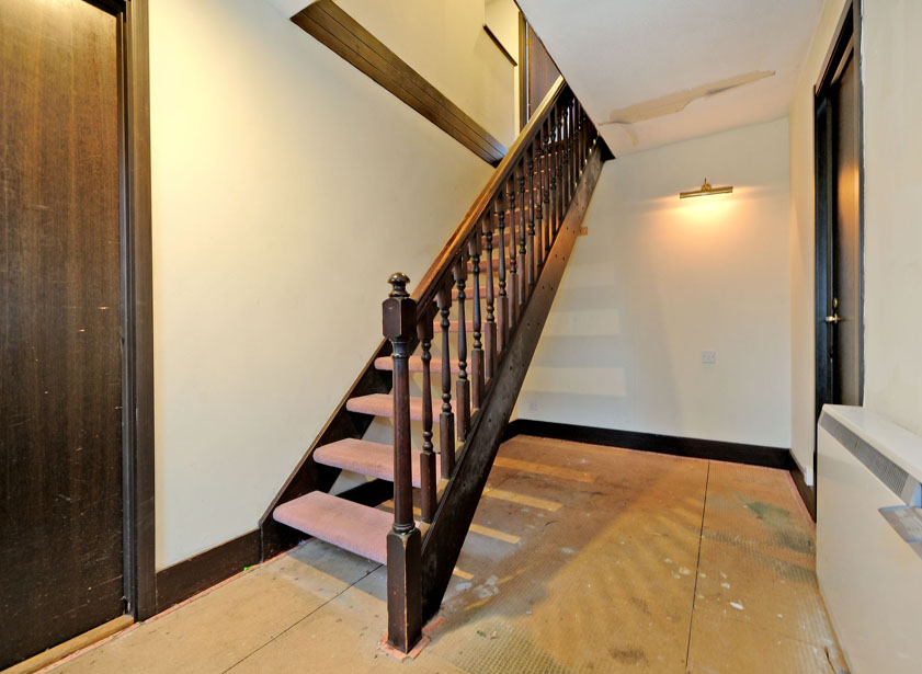 A carpeted, open tread staircase rises to the upper landing where a hatch gives access to the attic.