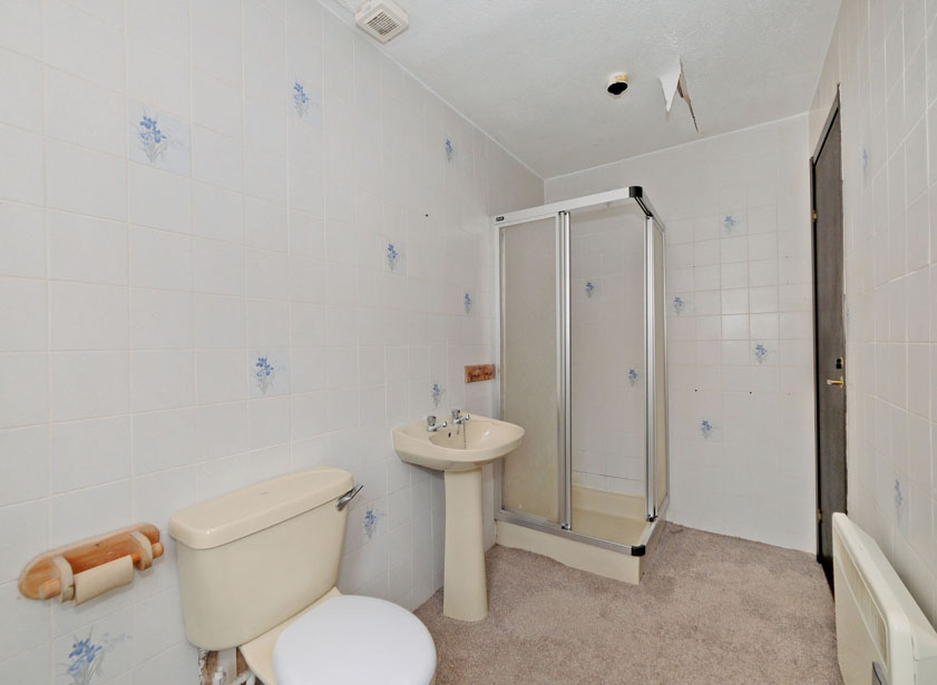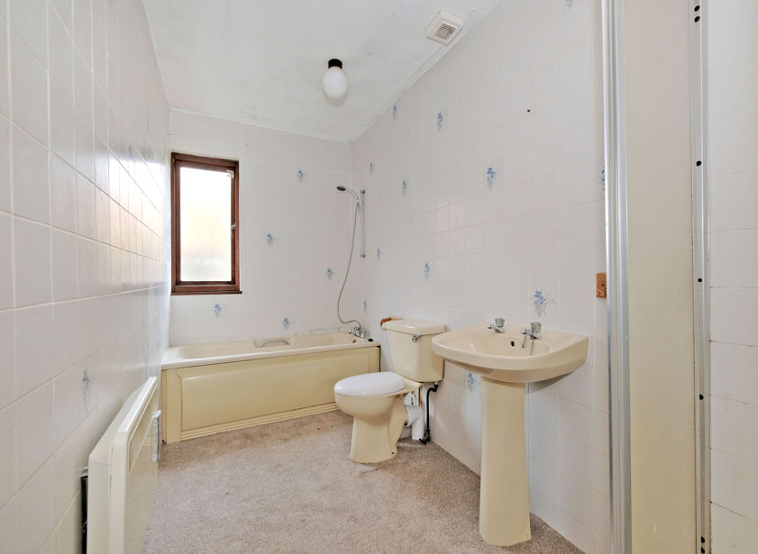 Located at the front, the principal bedroom provides excellent fitted storage facilities and is served by the en-suite bathroom comprising bath with shower above (shower head missing), wash hand basin and WC.