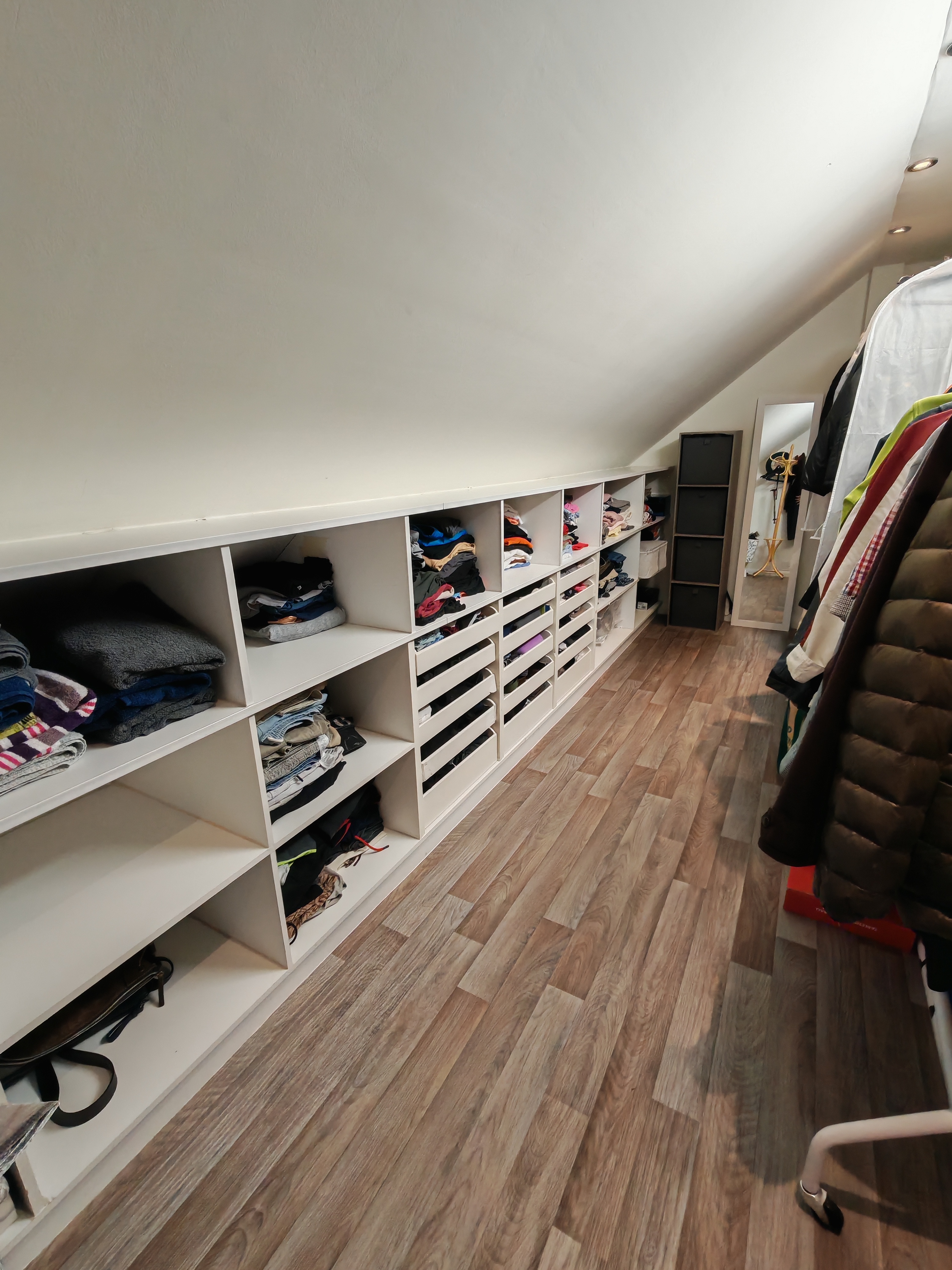 Ascending the carpeted staircase, there is first the mezzanine landing with deep display shelf. On the first floor, the landing provides access to the attic via a ceiling hatch.