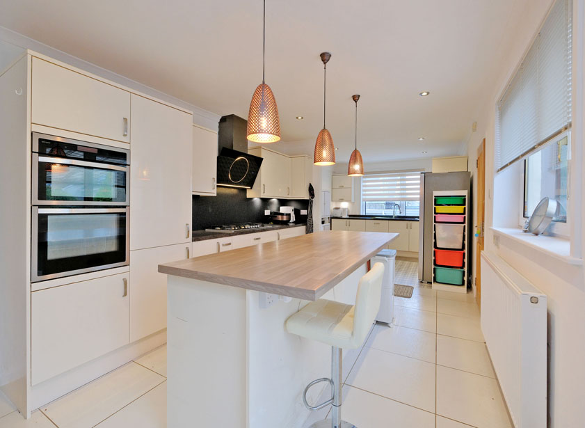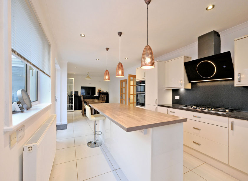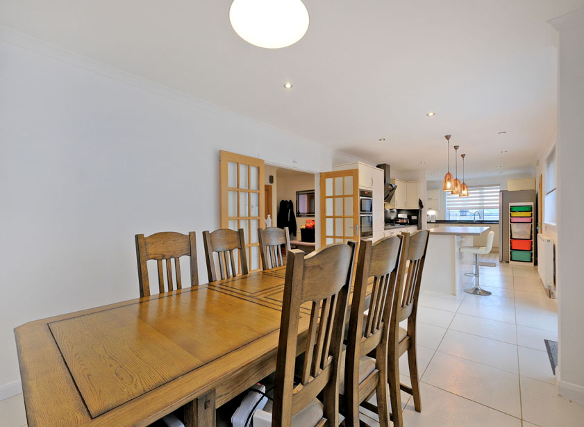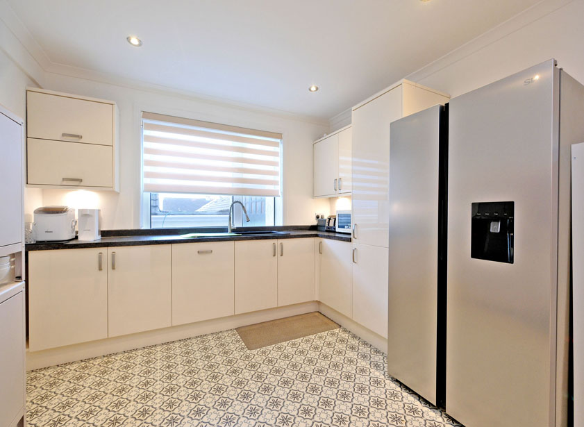 A set of partially glazed doors lead from the reception hall into the generously proportioned dining kitchen, which truly lies at the heart of this home. Providing ample space for formal dining and entertainment, the dining kitchen is of neutral decoration with ceiling spotlighting, while a glazed door allows access to the sheltered terrace beyond. The contemporary kitchen features an attractive range of cream gloss base and wall units, with splash back tiling and extensive roll top work surfaces incorporating a six ring gas hob with extractor fan and a composite sink with drainer. The large central island incorporates a breakfast bar area for informal dining, in addition to a range of undercounter storage facilities. Within the kitchen there is an integrated dishwasher and American style stainless steel fridge/freezer.