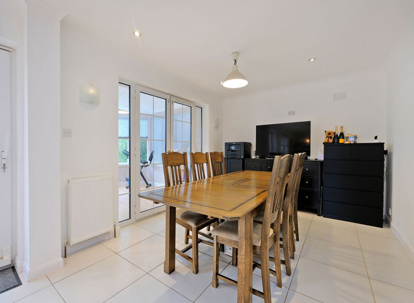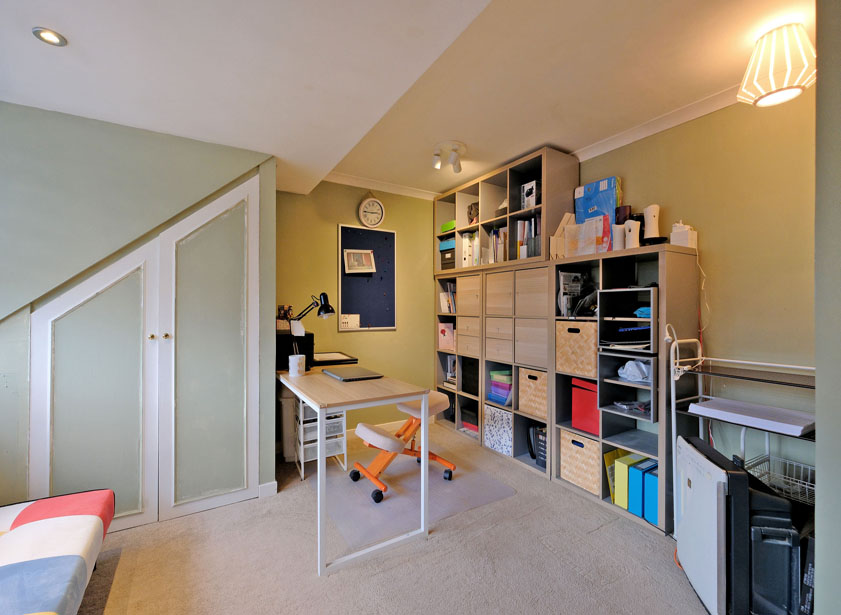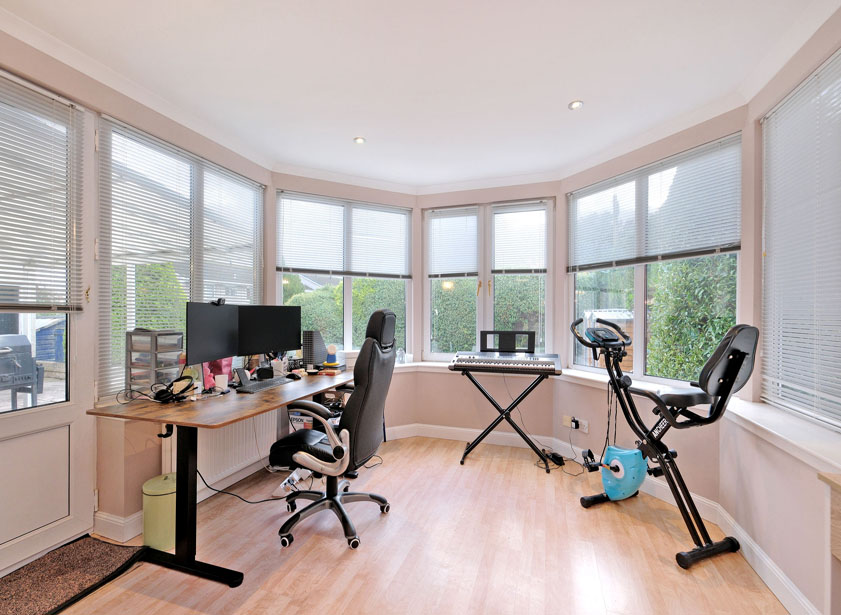 Accessible from the dining kitchen, French doors open into the well proportioned sun room which overlooks the rear garden via deep silled windows. A versatile living space, the sun room is currently utilised as a home office.