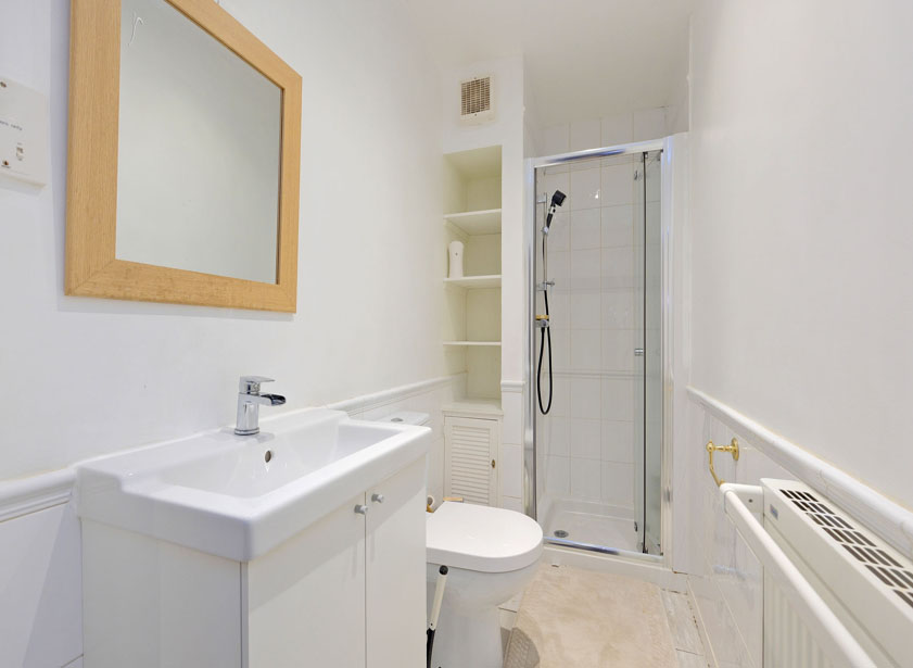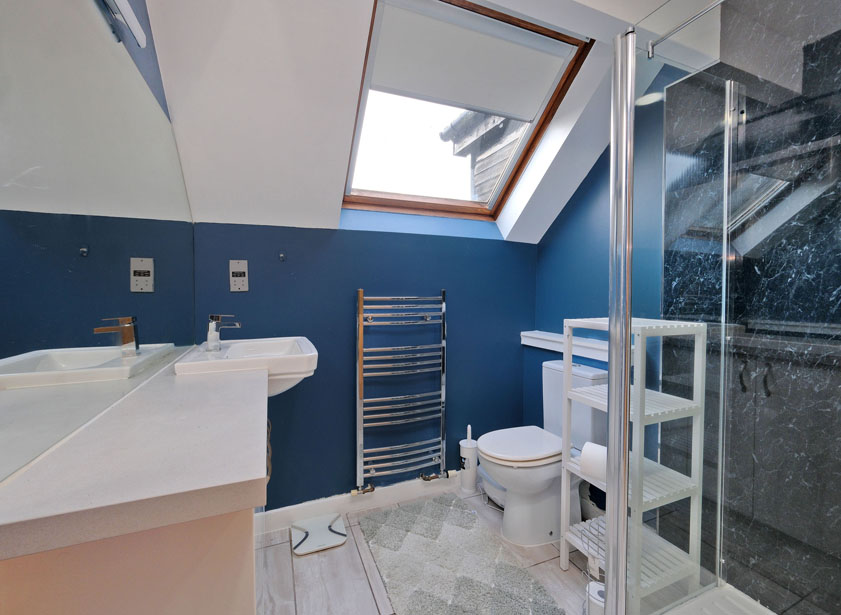 Completing the living accommodation is the bright family shower room. Fitted with tiled flooring, a double walk in shower enclosure includes a mains shower appliance, while a contemporary style vanity unit incorporates a wash hand basin. Further features include a white WC, chrome towel rail and a large frosted window.