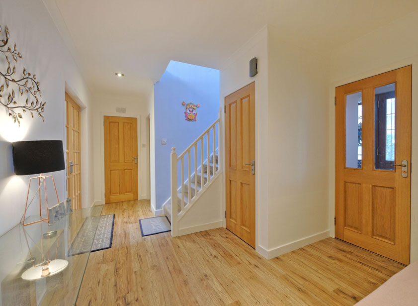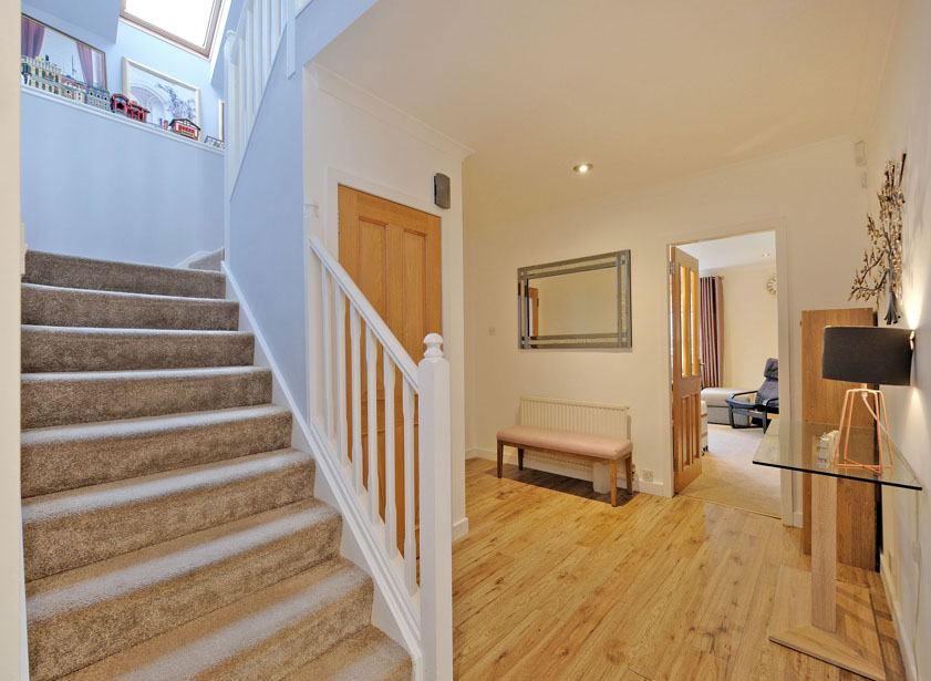 From the entrance vestibule a partially glazed door leads into the spacious reception hall. Fitted with ceiling spotlights and laminate wood effect flooring, a carpeted staircase leads to the living accommodation on the first floor. An under stair cupboard provides storage for larger household items, while there is also a range of shelving.