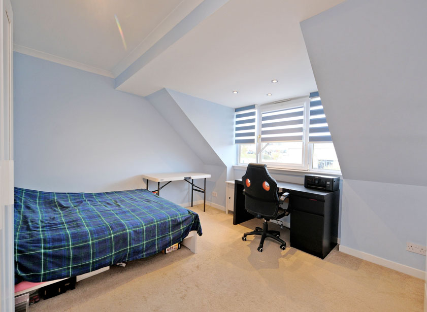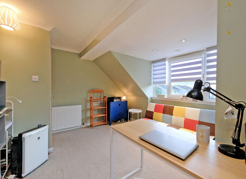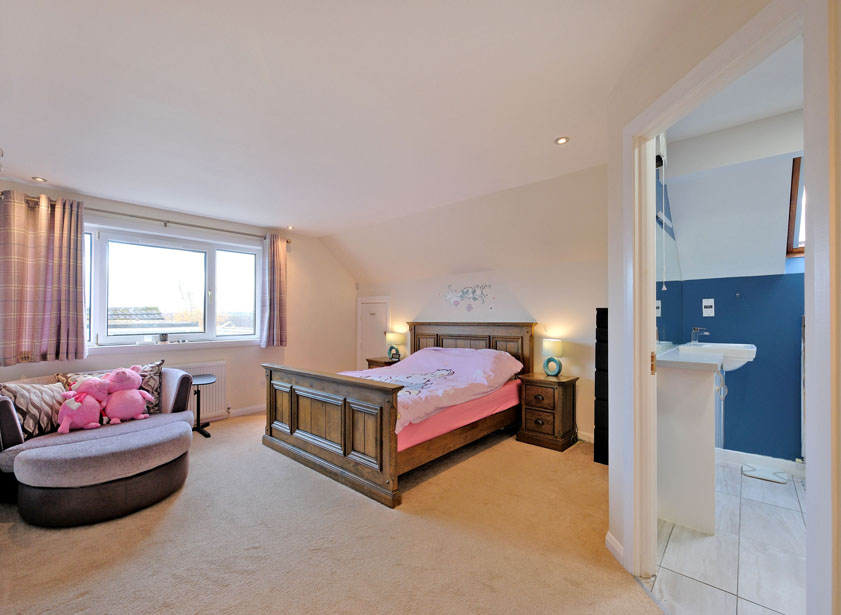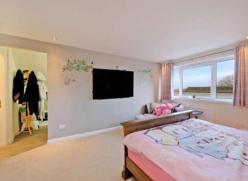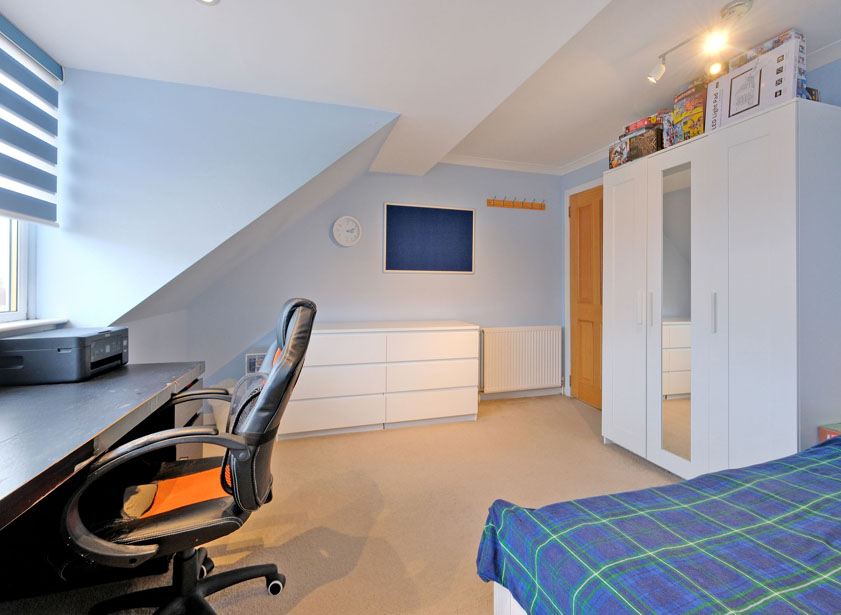 The principal bedroom suite enjoys far reaching views across Cults to the hills beyond. A generously proportioned room of pleasant decor and cream carpeting, the bedroom benefits from an abundance of storage facilities, including a walk in wardrobe with lighting and shelving, while there is also a bespoke dressing room area. The principal bedroom also boasts a well appointed ensuite shower room. Featuring a double walk in shower enclosure with mains shower appliance, a vanity unit incorporates a white wash hand basin with panel mirror above, while there is also a white WC and a wall mounted extractor fan.