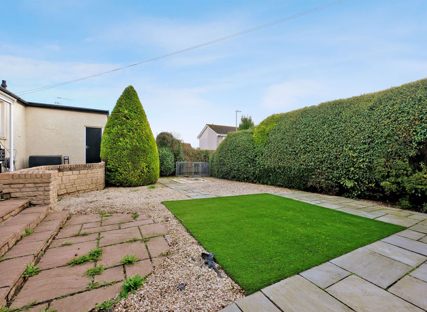 The fully enclosed rear garden is partially laid to lawn and extensively bordered by attractive paving and decorative stone chips. Mature hedging and trees provide a high degree of privacy, while a raised terrace accessible from the dining kitchen benefits from a canopy which provides shelter during the wetter weather. The two sheds will remain.