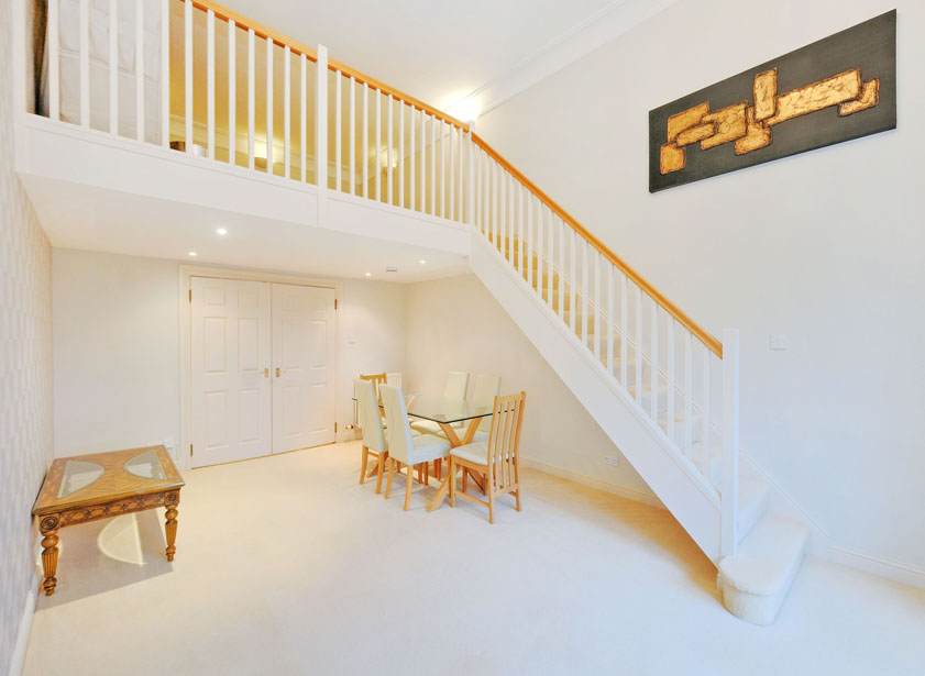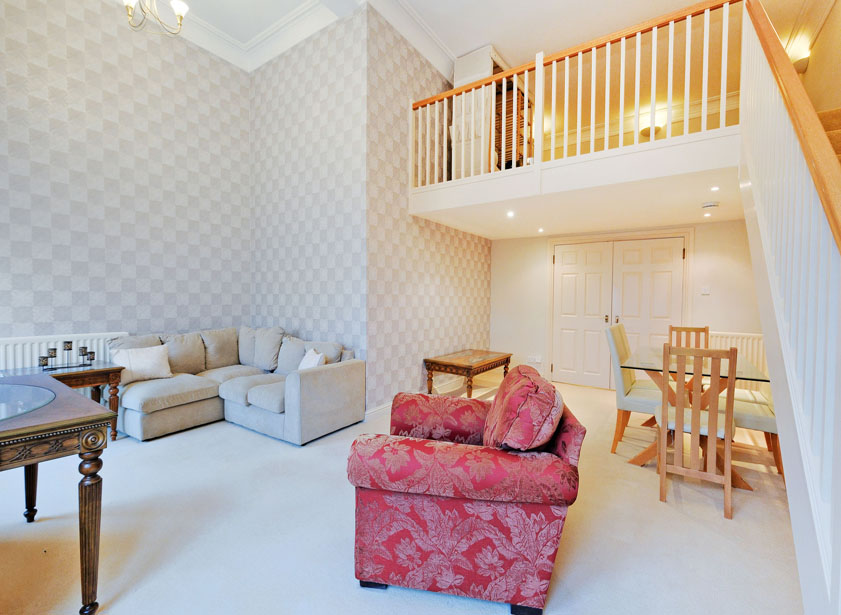 The apartment comprises a welcoming reception hall, a generously proportioned lounge/ dining area featuring large windows that allow ample of natural light to fill the area. A carpeted staircase leads to the galleried mezzanine level believed suitable for study/ further occasional bedroom accommodation. A well-appointed galley kitchen is fitted with a wide range of wall and base units and appliances. There are two well-proportioned double bedrooms, with the main bedroom being further enhanced by an ensuite shower room. Both bedrooms provide ample space for free standing furniture. A well-appointed bathroom, fitted with a three piece suite and shower over the bath completes the accommodation.