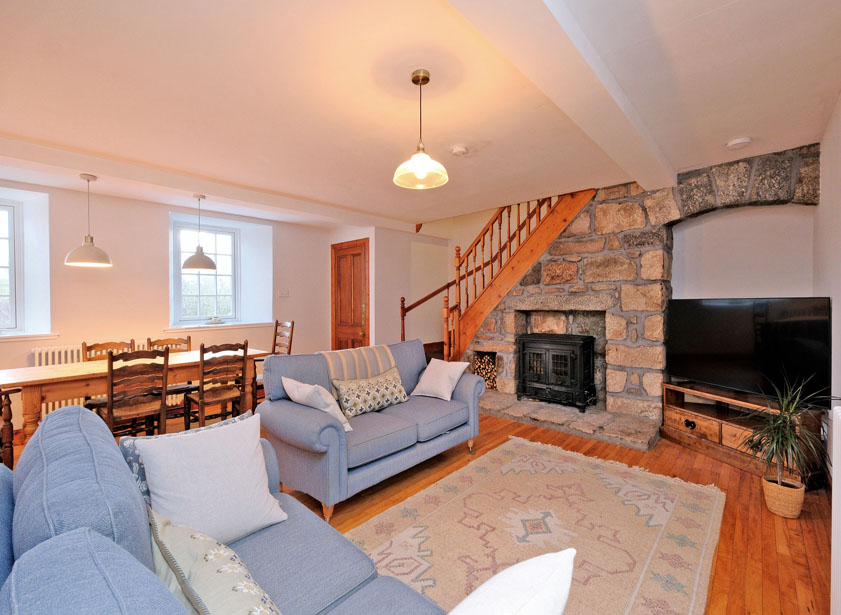 From the entrance hallway, a solid wood door leads to the property’s lounge. The heart of the home, this generously proportioned room features two front facing windows and a recessed stove set within an exposed granite surround and hearth. The current occupiers utilise this large room as a dual-purpose lounge and dining area. To the side of the room, a carpeted staircase ascends to the first-floor landing.